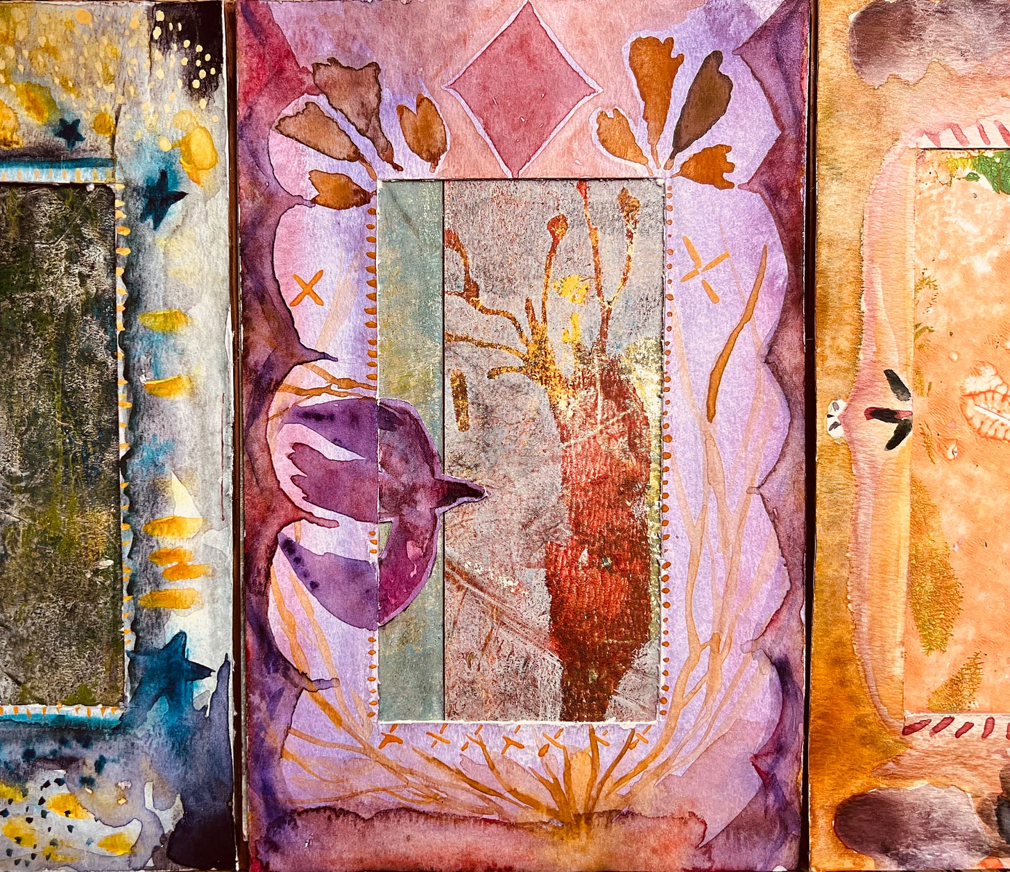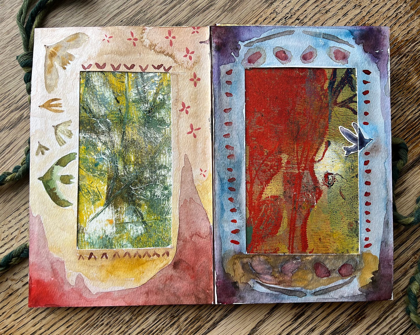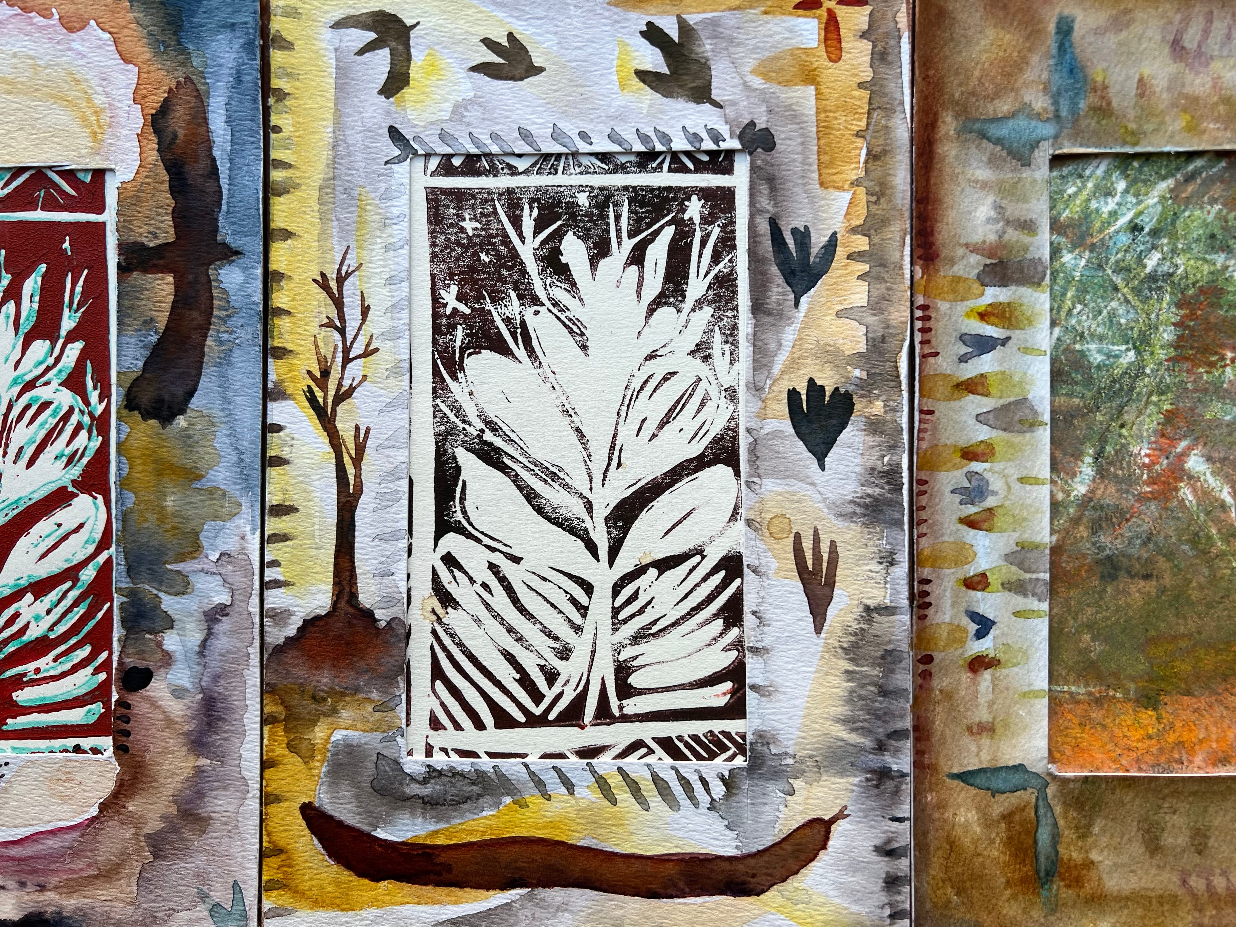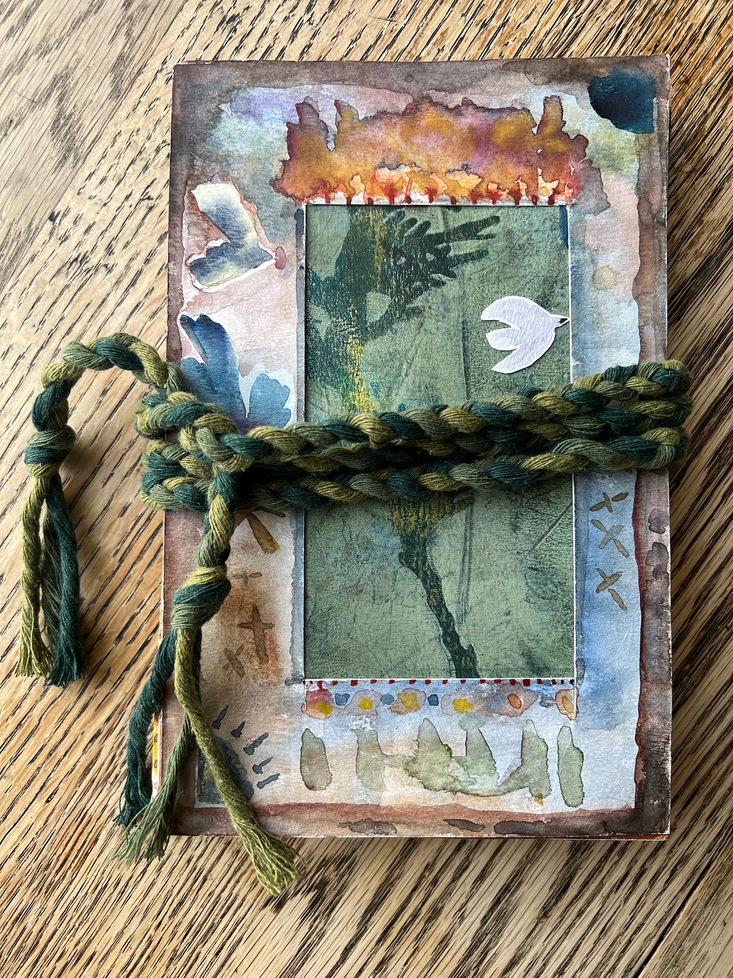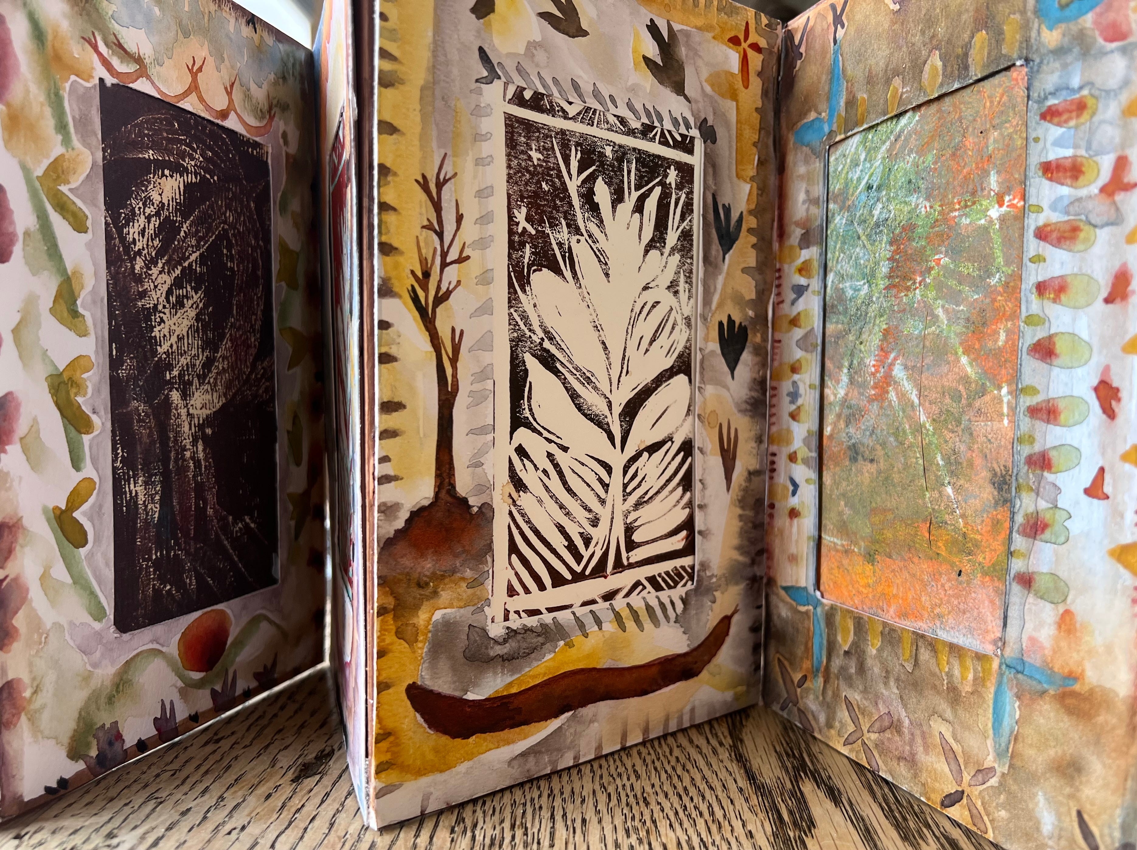 I pieced the book together from scraps of book board, layered watercolor paper over the top, and sealed it with archival glue. The “windows” are little cutouts revealing layers of linoleum and gelli plate prints beneath, with watercolor birds collaged on top.