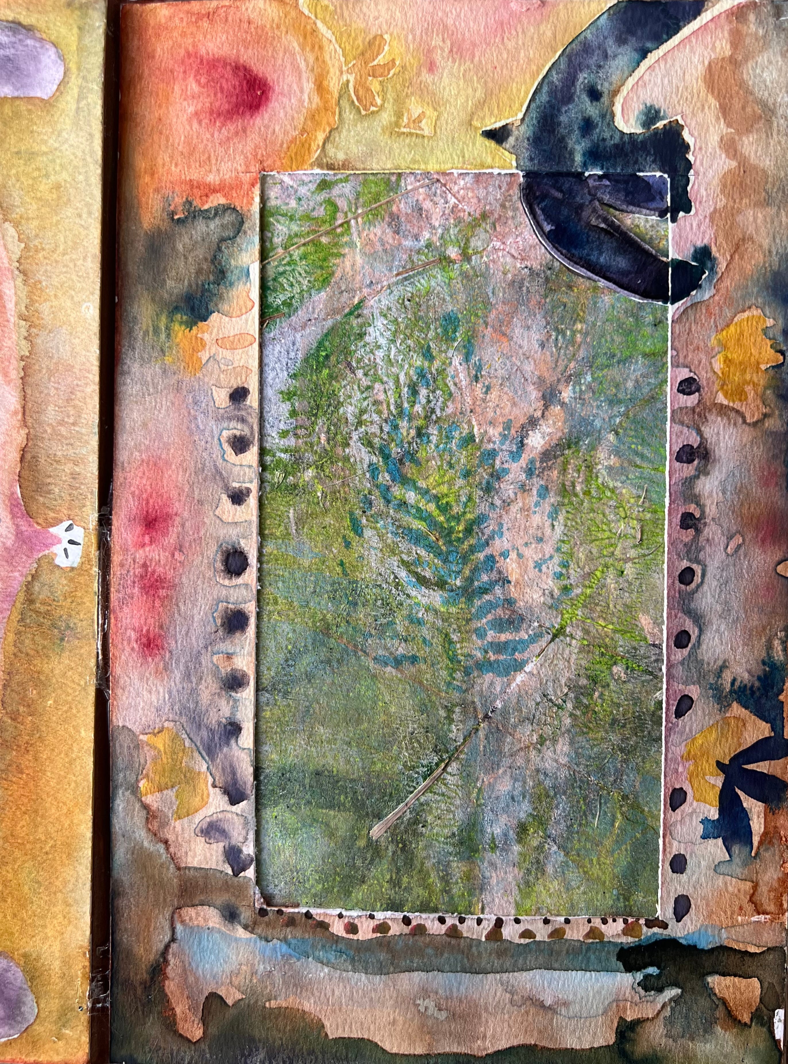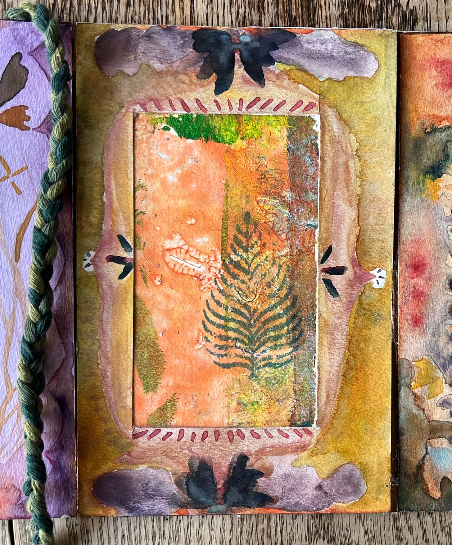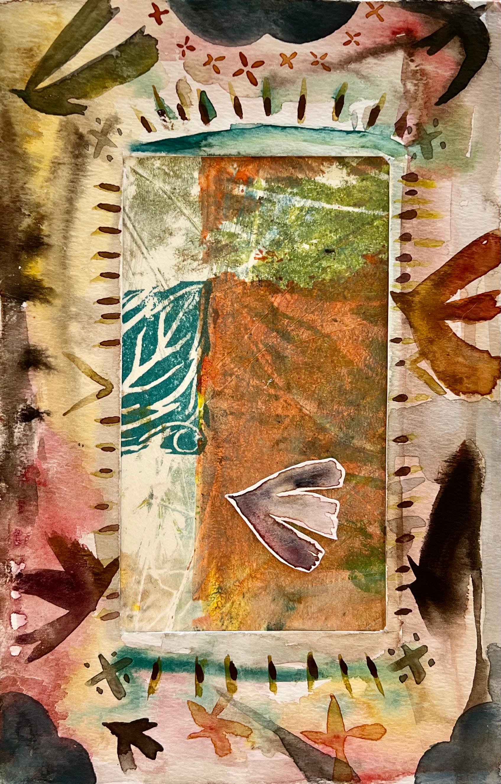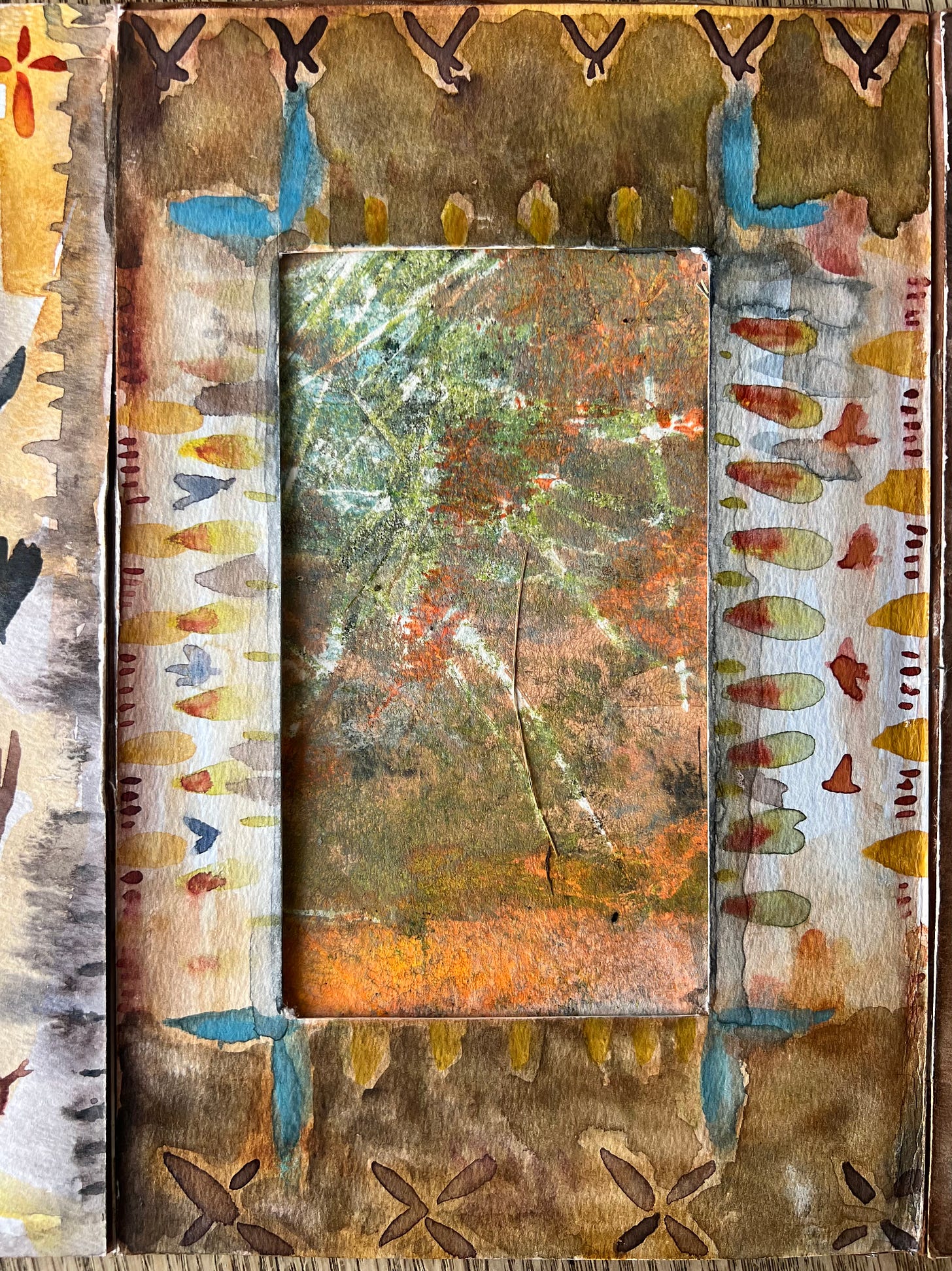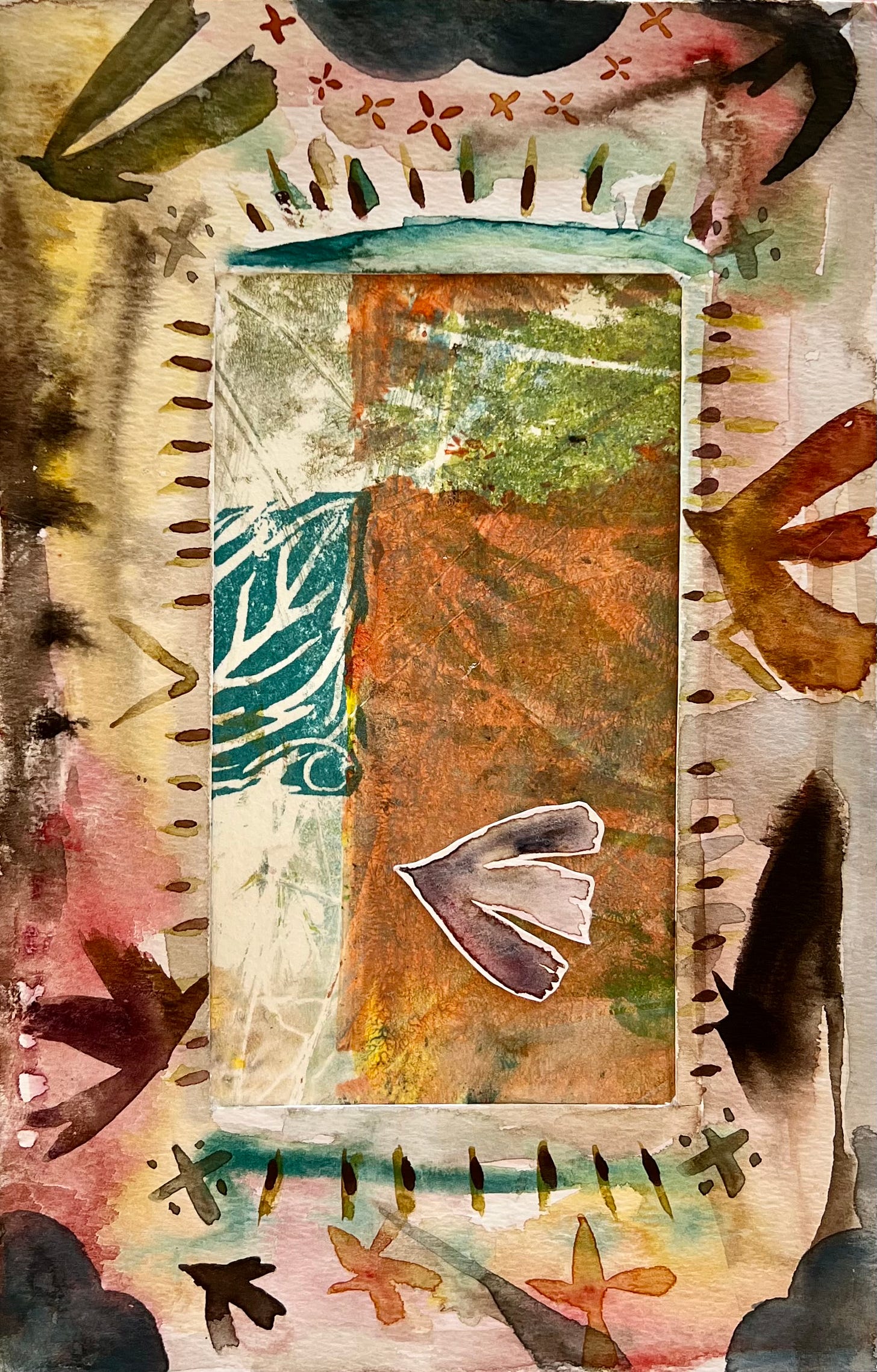 I pieced the book together from scraps of book board, layered watercolor paper over the top, and sealed it with archival glue. The “windows” are little cutouts revealing layers of linoleum and gelli plate prints beneath, with watercolor birds collaged on top.